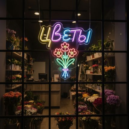 Неоновая вывеска «Цветы с букетом» — LED неон жёлтый, розовый, зелёный и голубой