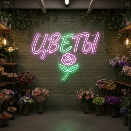 Неоновая вывеска «Цветы с розой» — яркий акцент для вашего цветочного салона