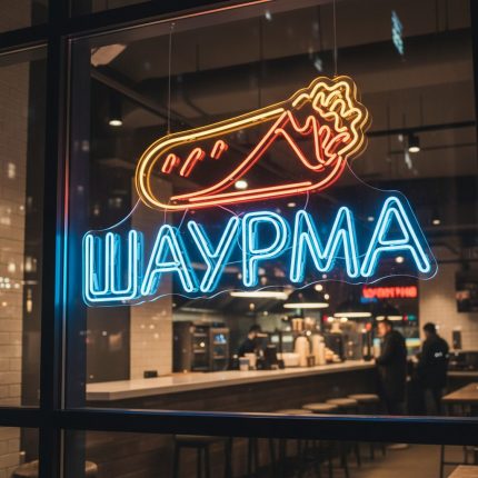 Неоновая вывеска «ШАУРМА» с жёлто-красно-синей подсветкой для кафе