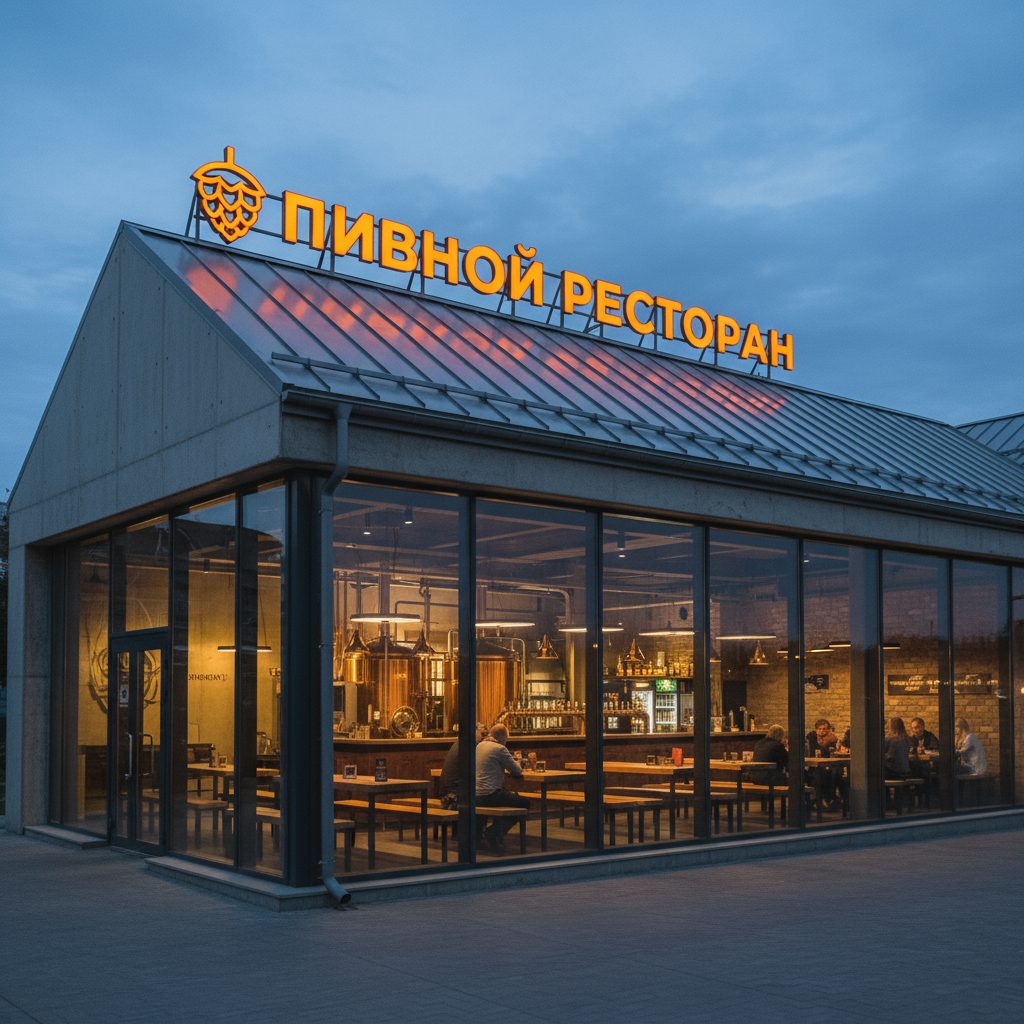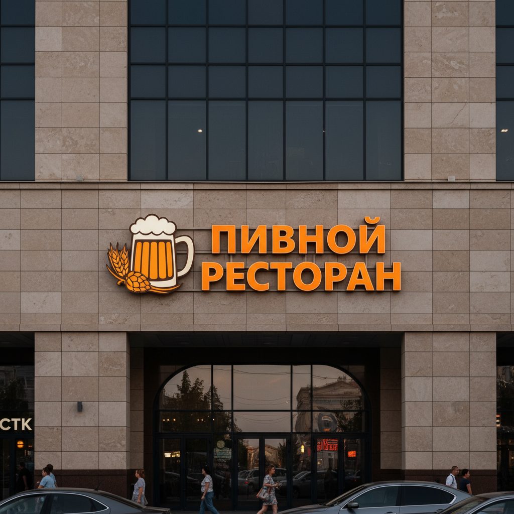 Пивной ресторан — это место, куда приходят вечером, поэтому вывеска должна быть заметной, но не слепящей.