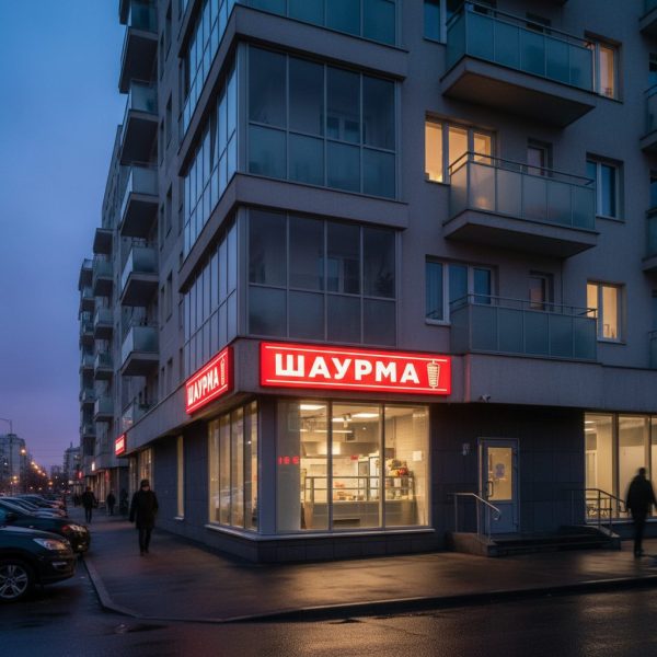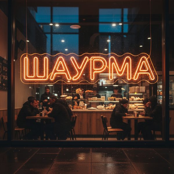 Точки шаурмы часто работают до поздней ночи, поэтому световая вывеска — обязательный элемент.