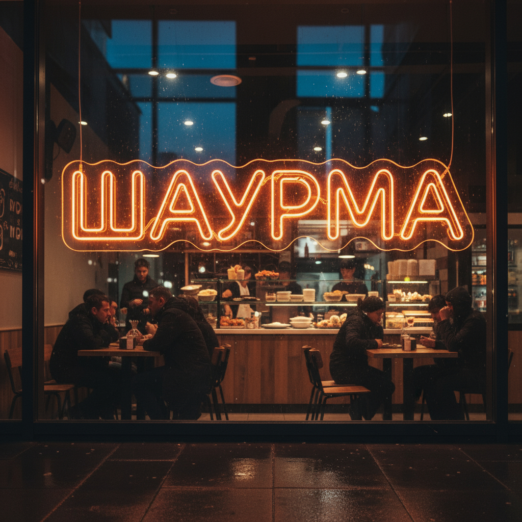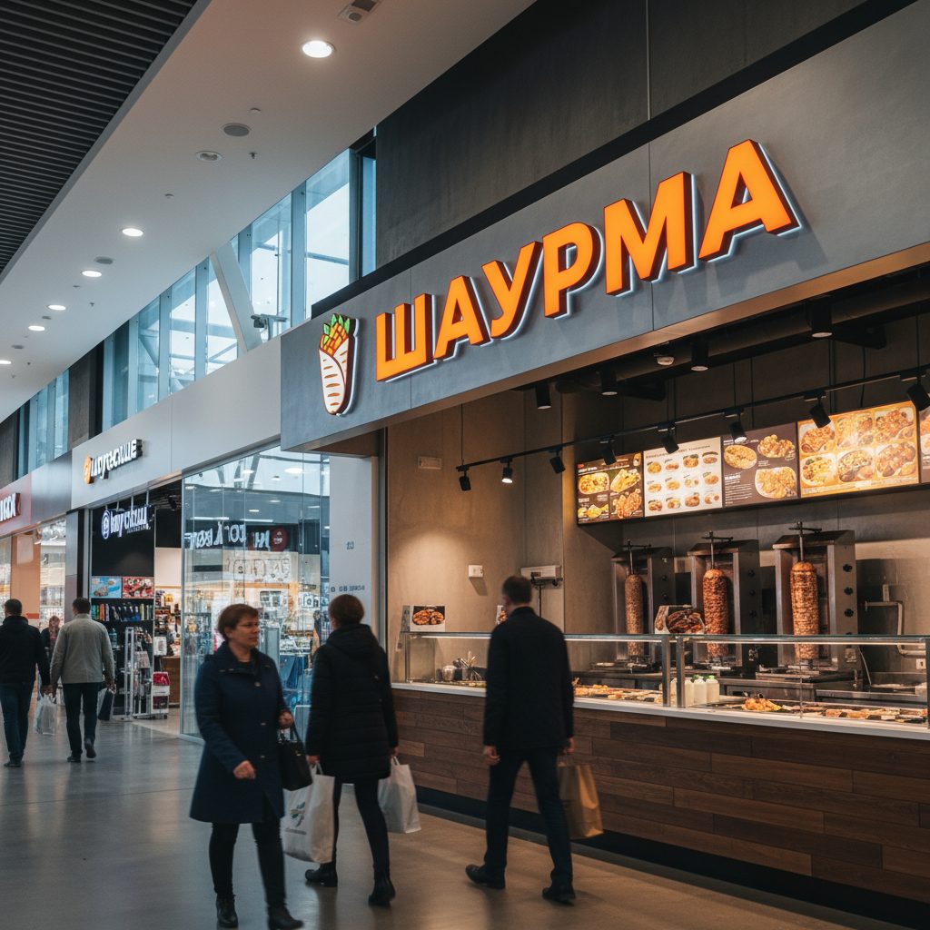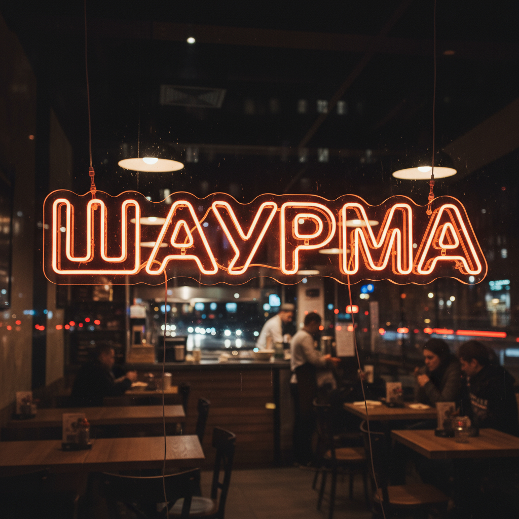 Вывеска должна ясно передавать, что здесь готовят шаурму — без сложных шрифтов и перегрузки.