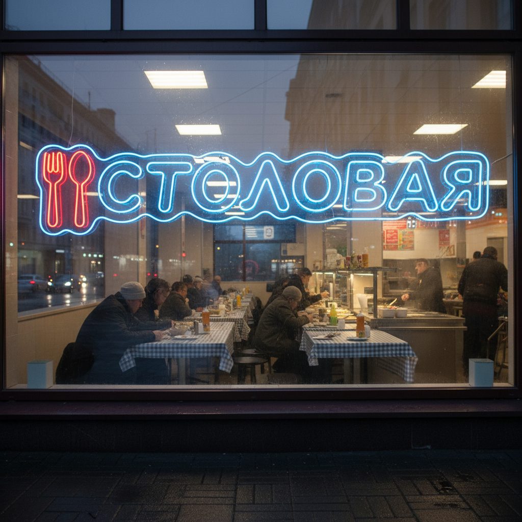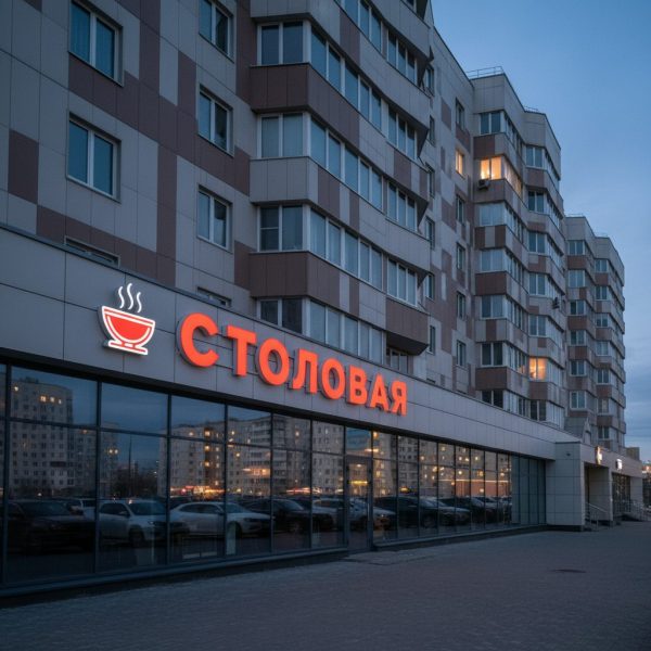 Для столовых важно, чтобы вывеска выделялась днём и в пасмурную погоду, но не была слишком яркой.