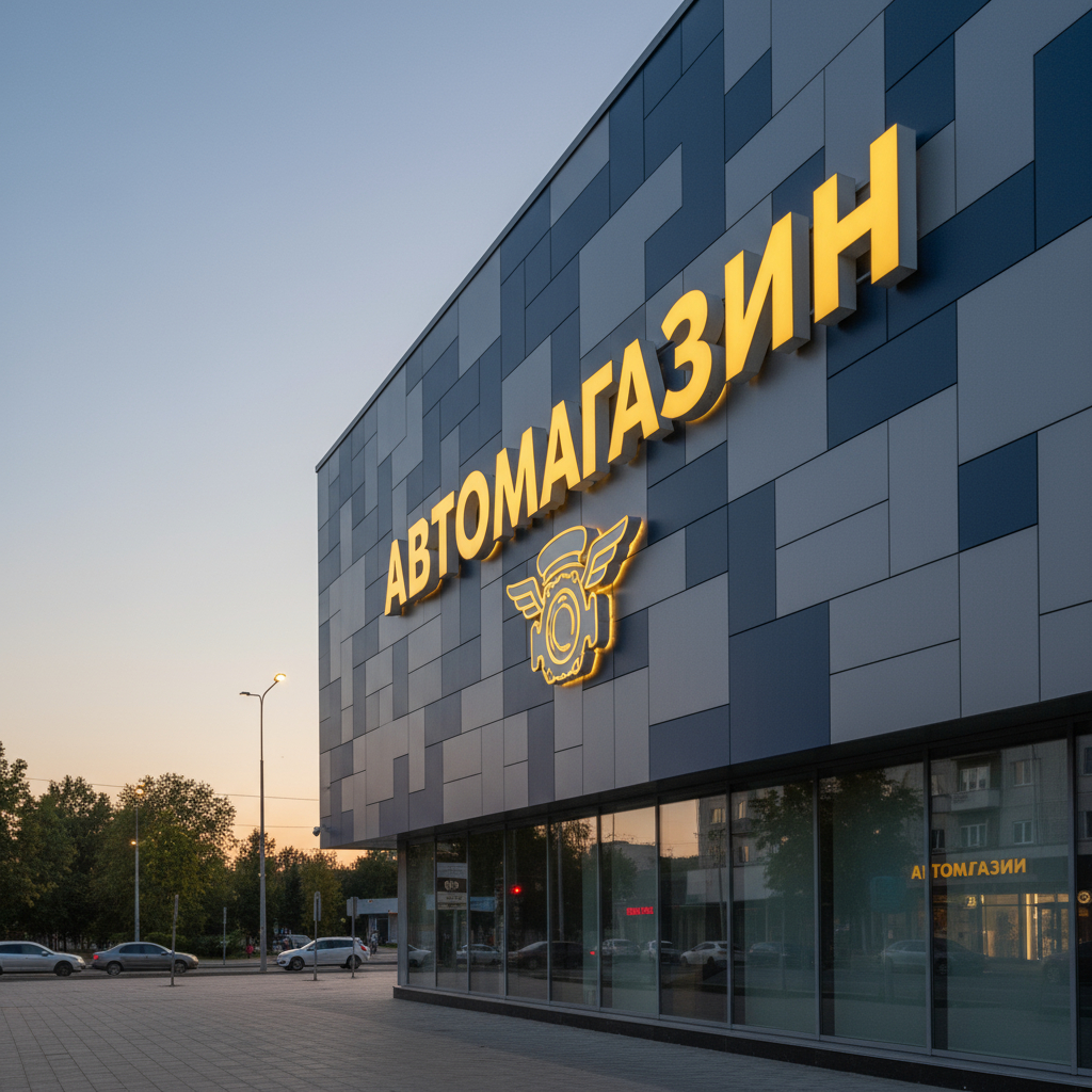 Автомагазин — это бизнес, где клиент ожидает чёткости, уверенности и профессионализма. Важно, чтобы фасад отражал эти качества. Современная вывеска помогает выделить точку продаж, подчеркнуть специализацию и вызвать доверие покупателей.