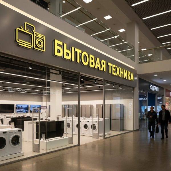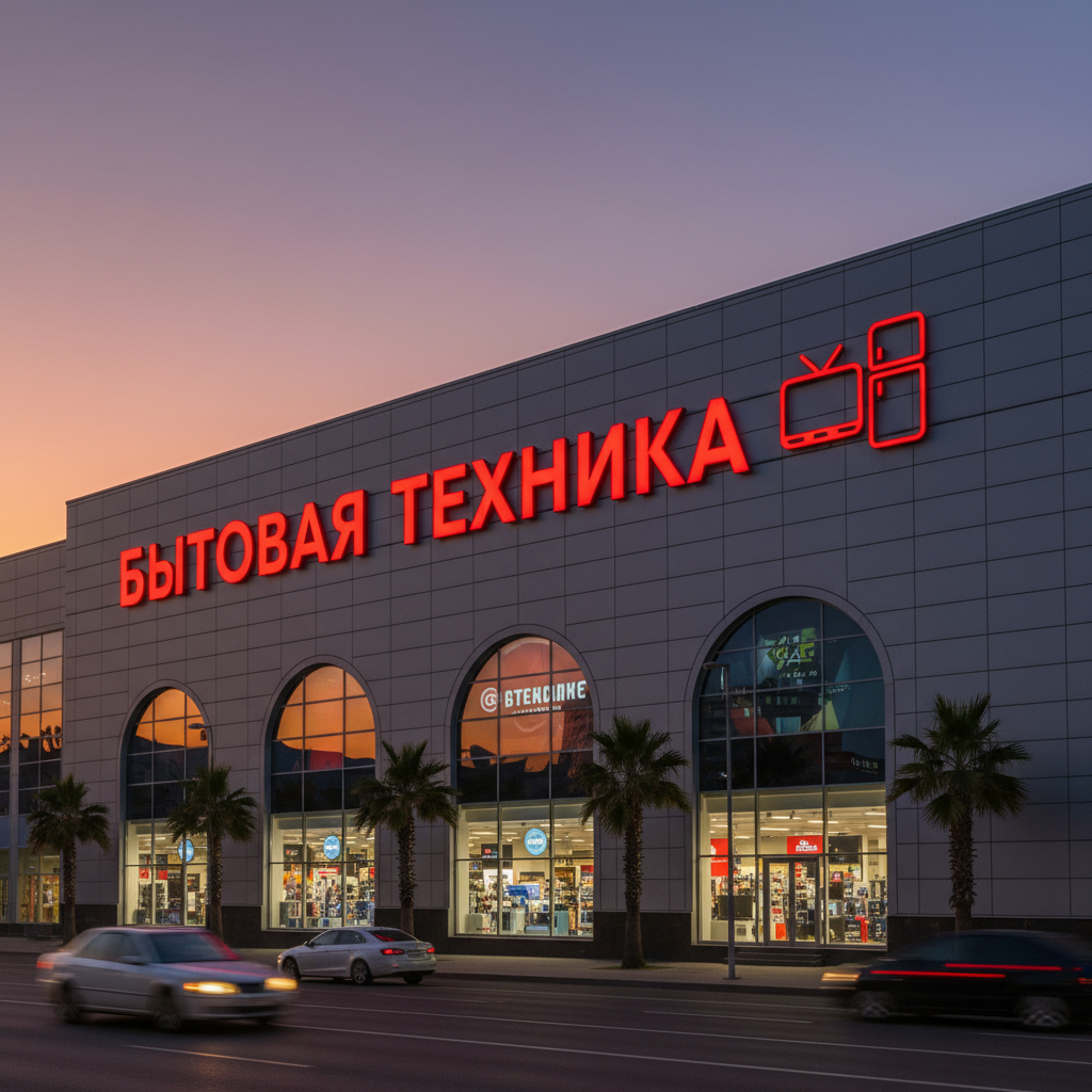 Для магазинов электроники и бытовой техники характерен лаконичный, технологичный стиль. Главное — чистые линии, читаемость и яркая, но не агрессивная подсветка.