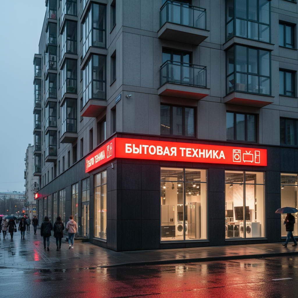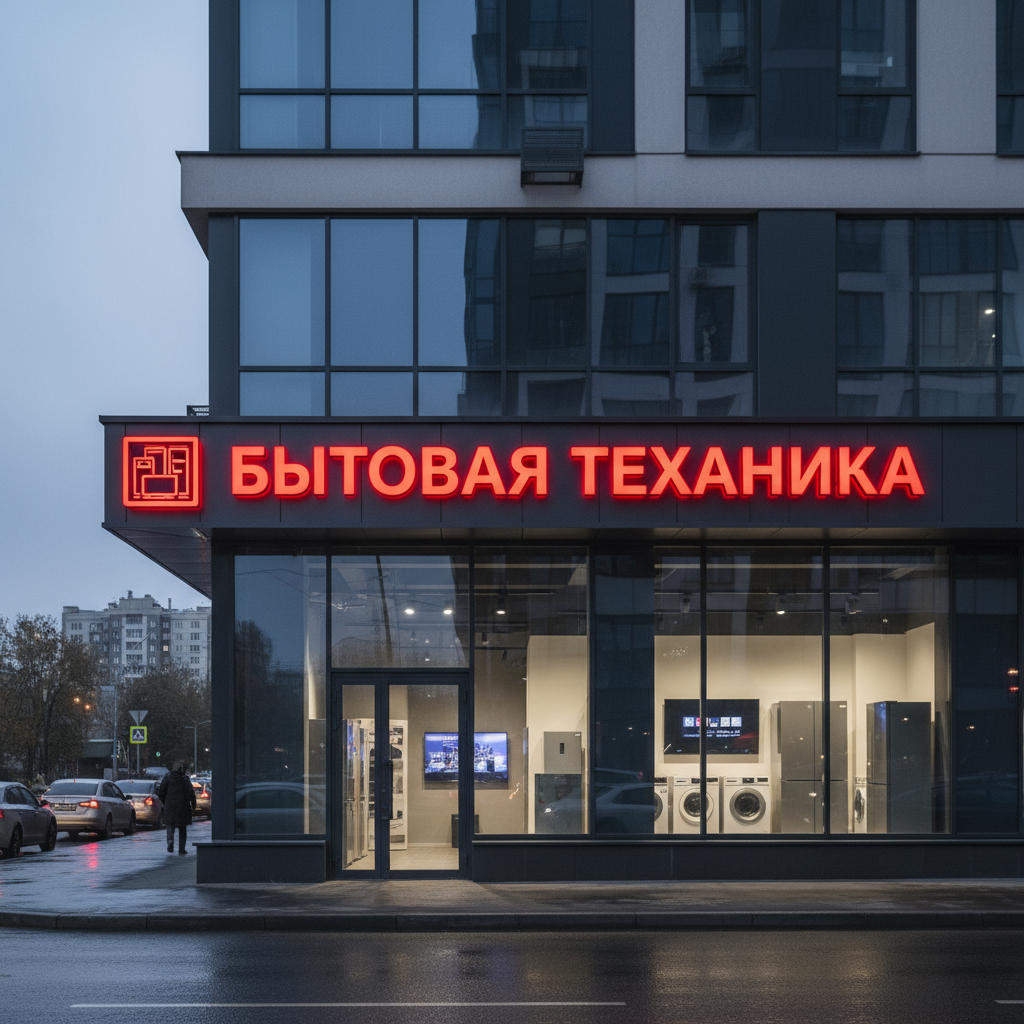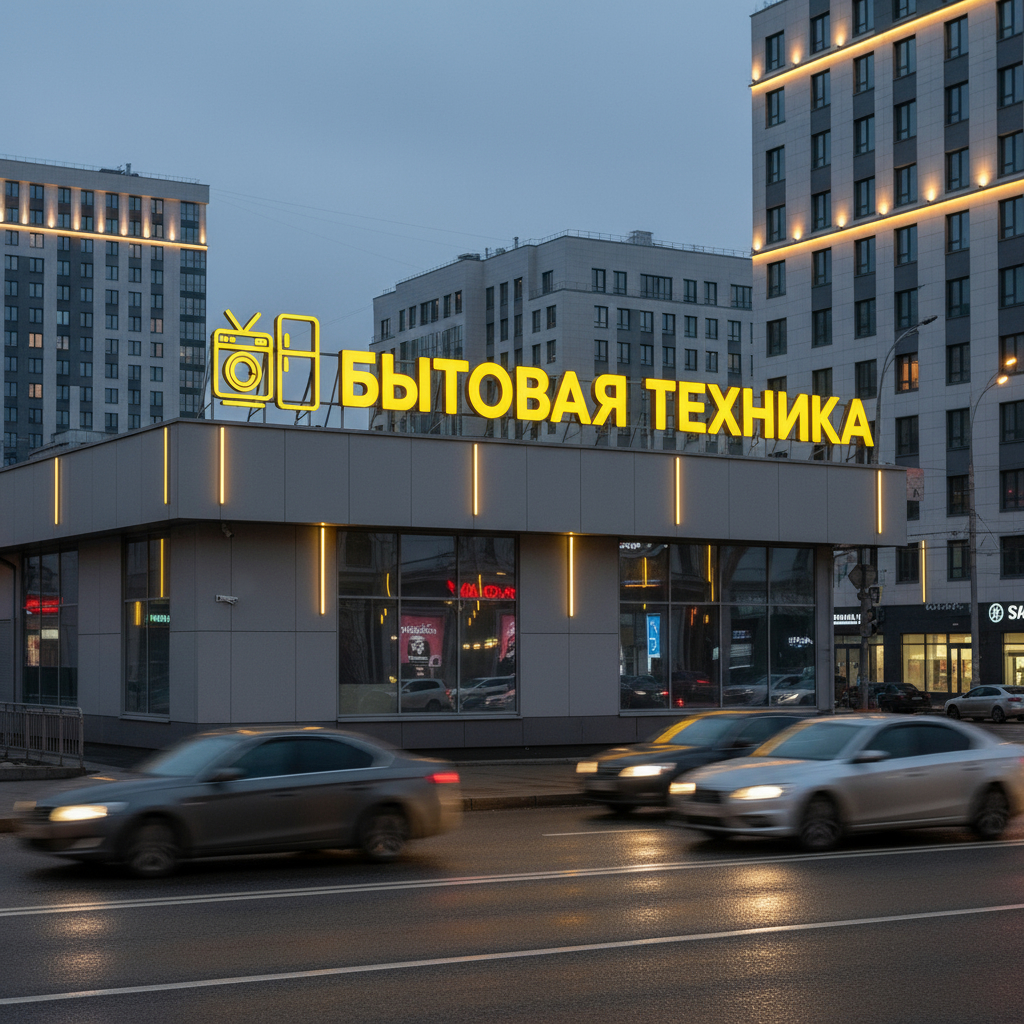 Магазин бытовой техники — это бизнес, где покупатель выбирает не только по цене, но и по уровню доверия. От внешнего оформления зависит, насколько серьёзным и профессиональным выглядит магазин. Фасадная вывеска — первое, что видит клиент, и именно она задаёт настроение: современный магазин, надёжные товары, качественный сервис.