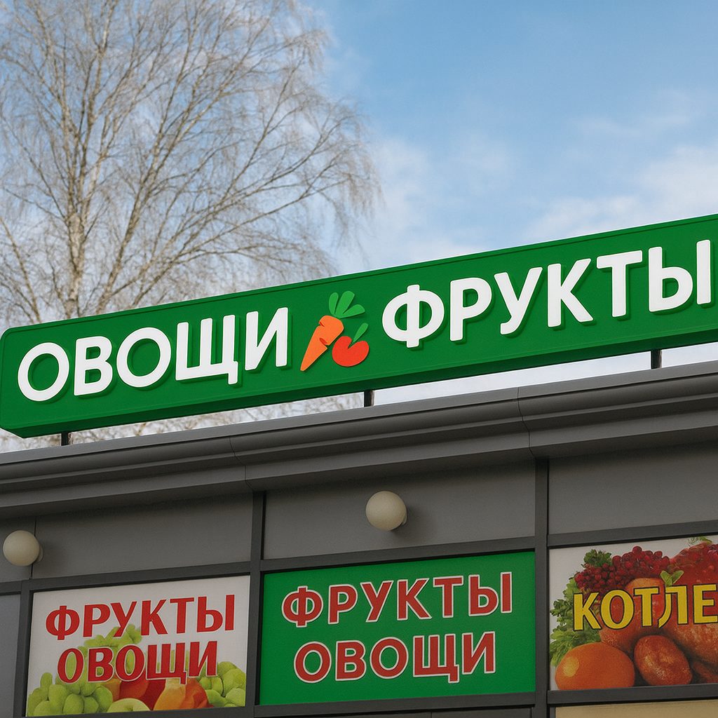 Магазины свежих овощей и фруктов — это всегда про цвет, естественность и доверие. Покупатель ожидает, что продуктовая точка будет ассоциироваться со свежестью, чистотой и качеством. Именно поэтому правильная вывеска играет ключевую роль: она не только обозначает магазин, но и создаёт визуальное ощущение свежести и натуральности ещё до того, как человек зайдёт внутрь.