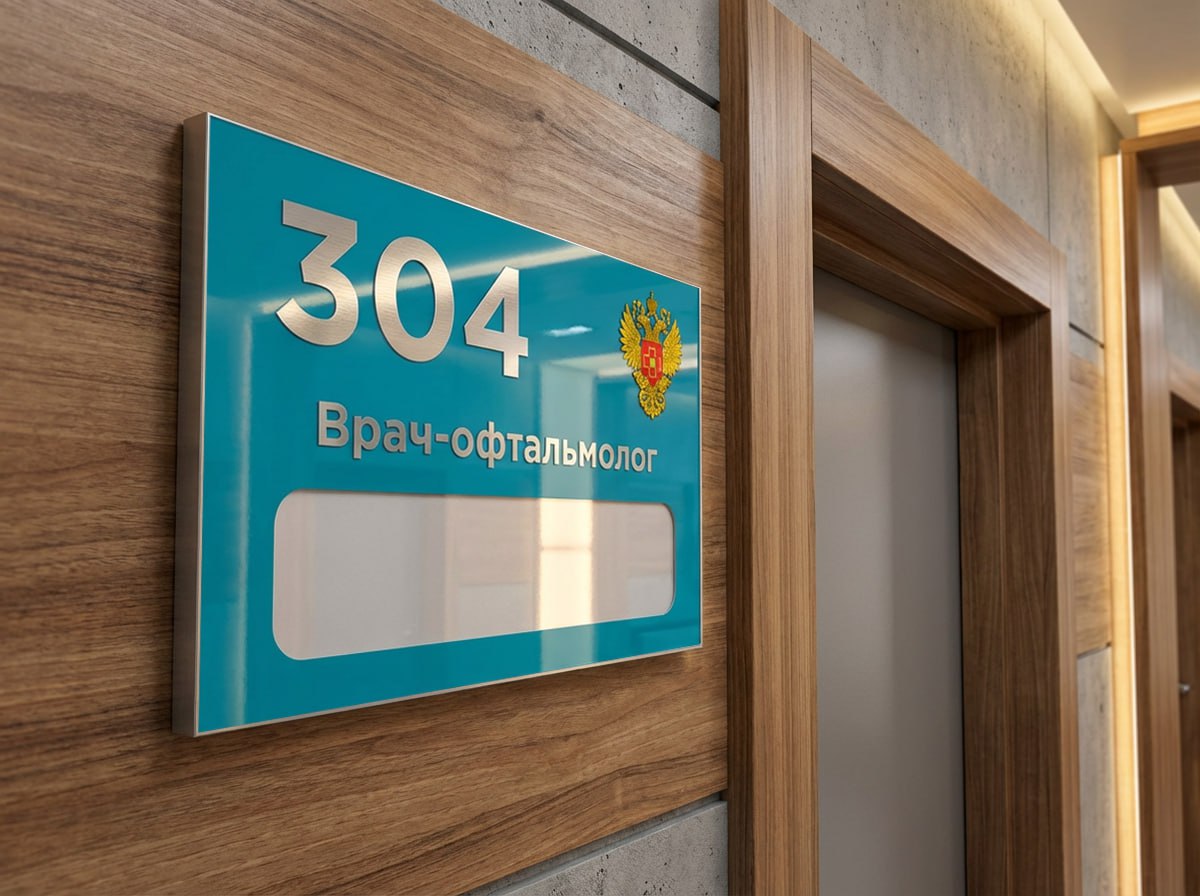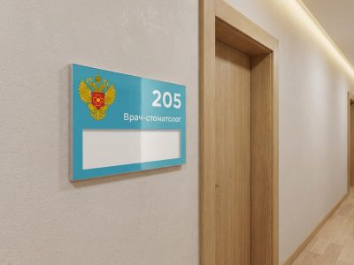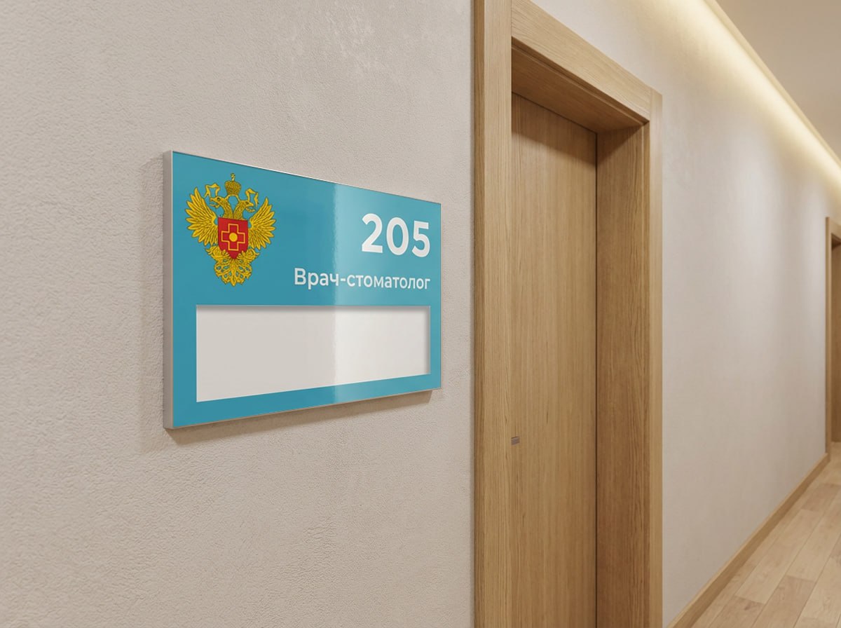 Кроме того, при разработке корпоративного стиля клиники очень важно поддерживать единый визуальный стандарт. Табличка на дверь кабинета с качественной УФ-печатью позволяет разместить неизменный логотип медицинского учреждения (или герб, если речь идет о государственной структуре), номер кабинета крупным и контрастным шрифтом, а сменное окно оставить исключительно под ФИО и часы работы. Это создает ощущение порядка, профессионализма и вызывает доверие у пациентов, облегчая им визуальную навигацию по длинным коридорам.