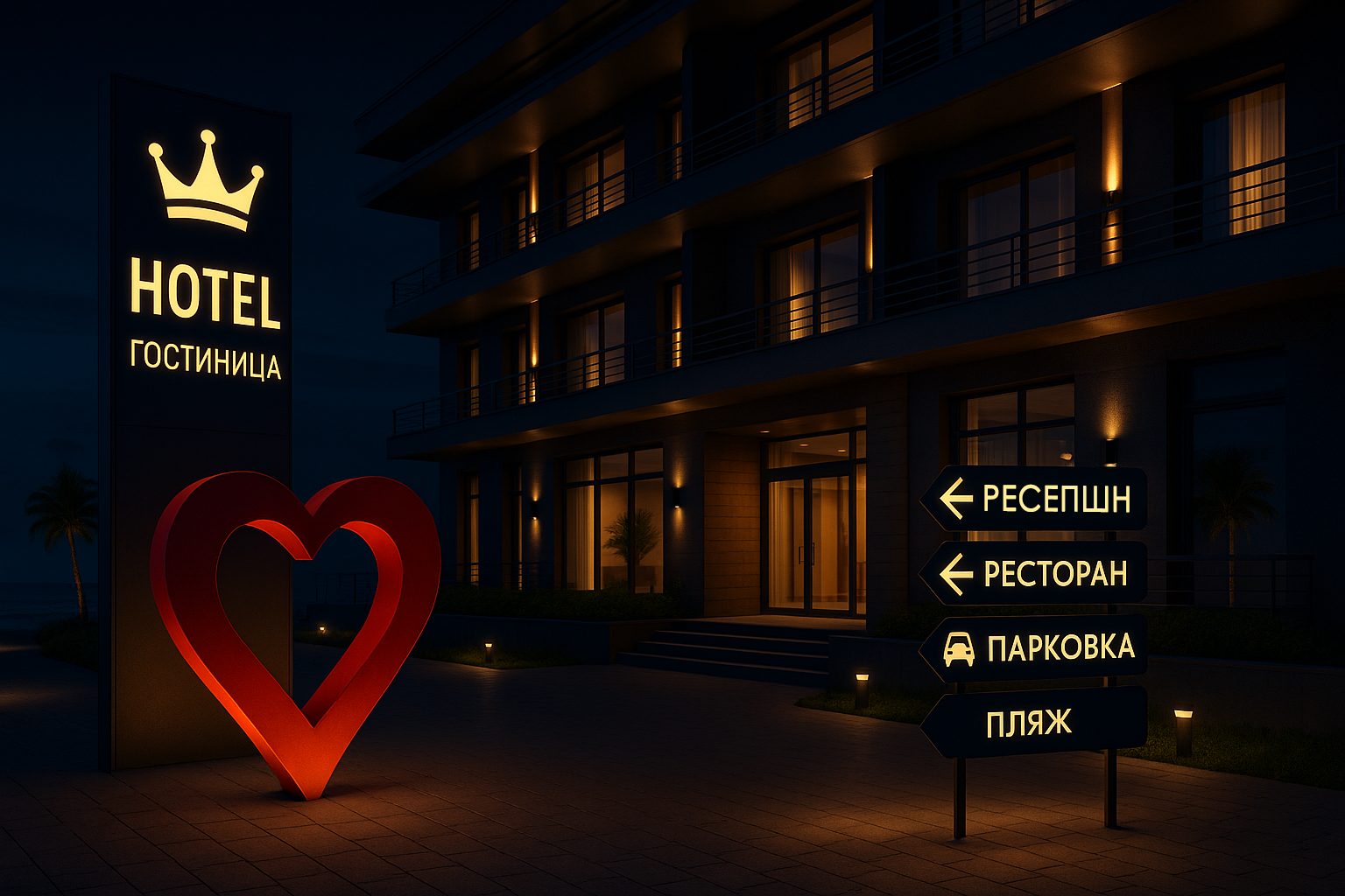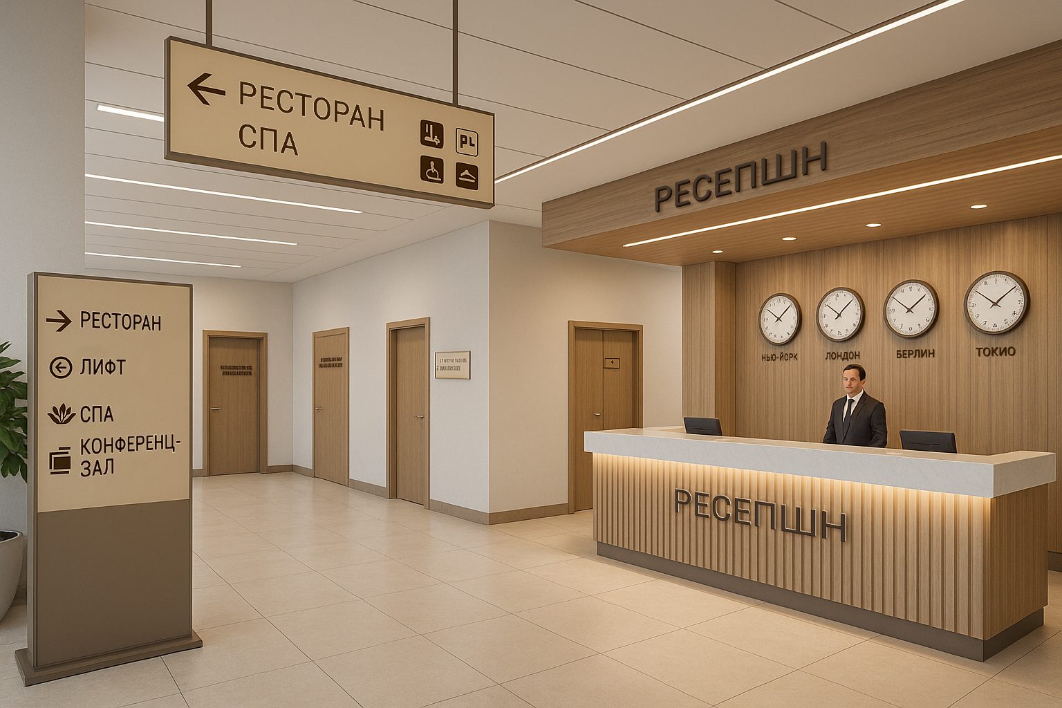 Предлагаем решения для навигации внутри корпусов, на этажах, в номерах, ресторанах, бизнес-залах, SPA-зонах, а также на парковках и прилегающей территории. Используем современные материалы (акрил, металл, ПВХ) и технологии (УФ-печать, фрезеровка, гравировка). Полный цикл: от проекта до монтажа.