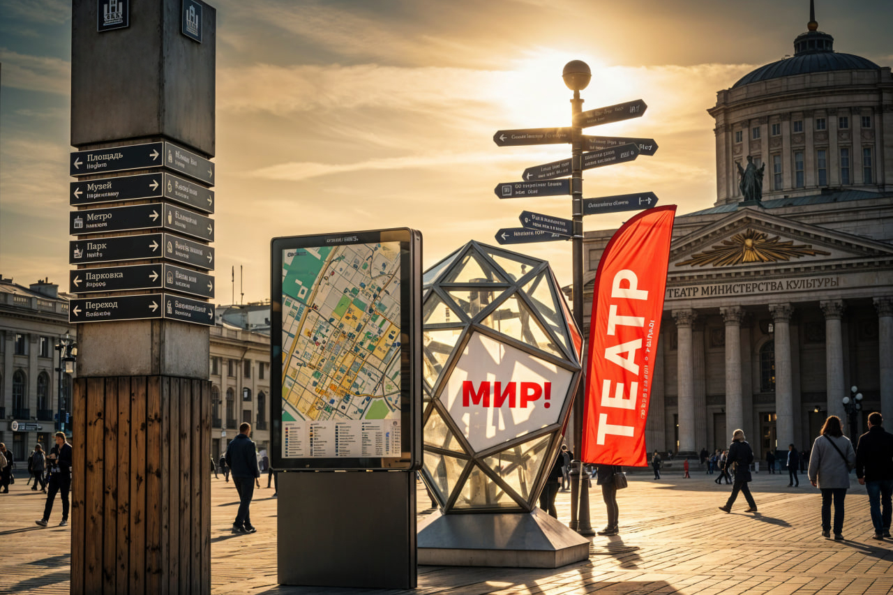 Решения дополняются МАФами: уличными пилонами, стойками, памятными табличками. Применяются технологии УФ-печати, гравировки, фрезеровки, материалы — ПВХ, акрил, композит, металл. Работаем под ключ: аудит, проект, изготовление и монтаж по Москве и всей России.