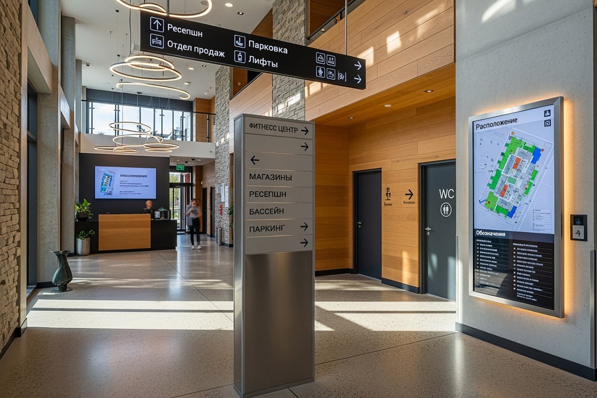 Жилой комплекс — это не просто место проживания, а организованное пространство с множеством функциональных зон: подъезды, парковки, дворы, детские и спортивные площадки, места отдыха, общественные и технические помещения. Для эффективного ориентирования в этой среде необходима комплексная система уличной и внутренней навигации. Она повышает комфорт жителей, упрощает работу обслуживающего персонала и создаёт цельный, ухоженный образ жилого пространства.